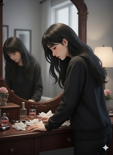 Aku bertumpu pada tepi meja rias, mencoba bernapas… tapi rasanya tidak ada udara yang masuk.