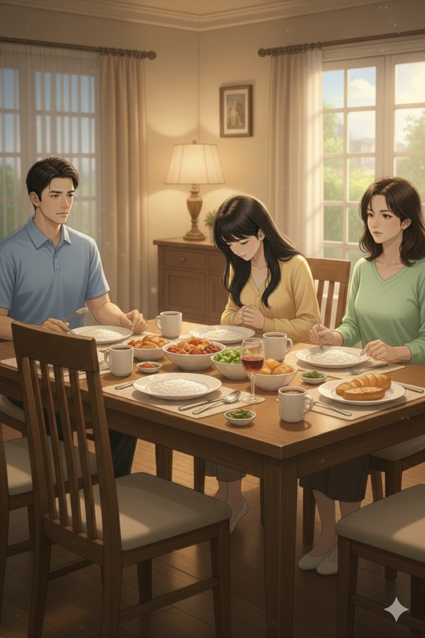 Tidak ada percakapan ringan, tidak ada senda gurau kecil seperti dulu. Hanya bunyi sendok yang beradu pelan dengan mangkuk—ritmenya kaku, terputus-putus, seolah setiap orang sengaja memilih diam agar tidak membuka luka yang masih segar.