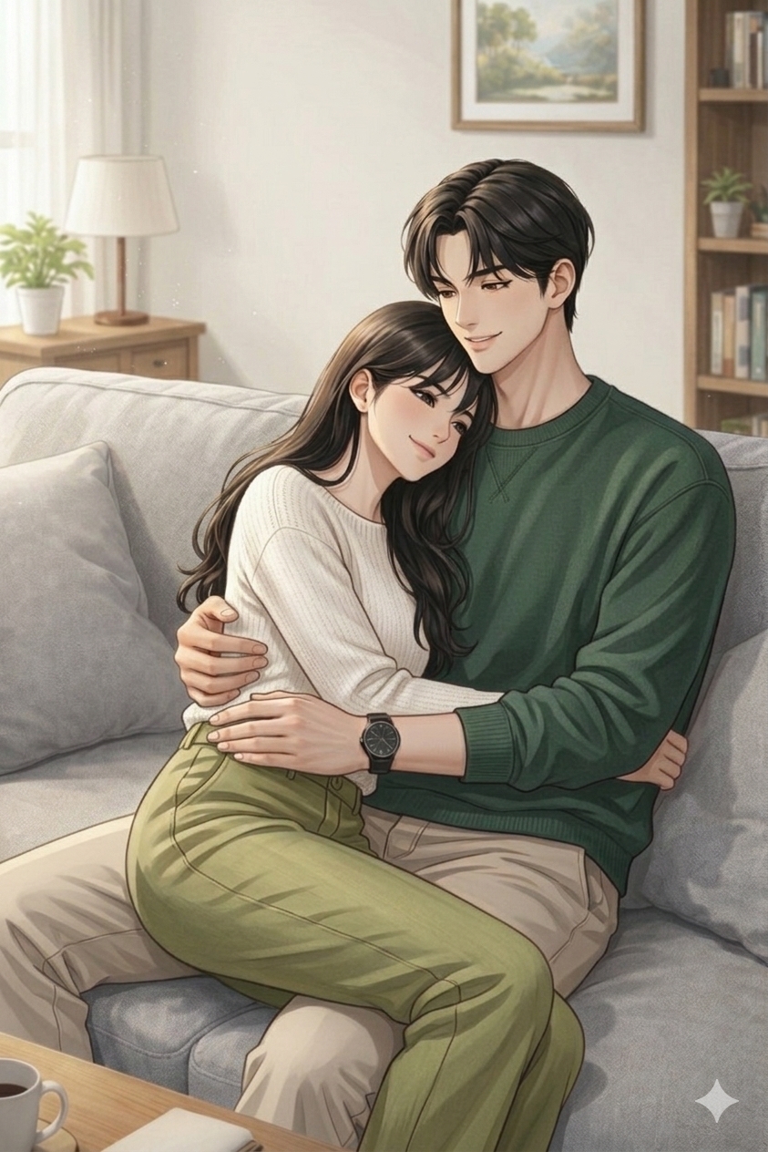Punggungku bersandar ke dadanya. Tubuhku pas di antara lengannya. Tangannya melingkar lembut di pinggangku, tidak menahan, tidak mengikat. Jari-jarinya sesekali bergerak pelan, seolah mengikuti ritme napasku, menenangkannya… dan menenangkanku.