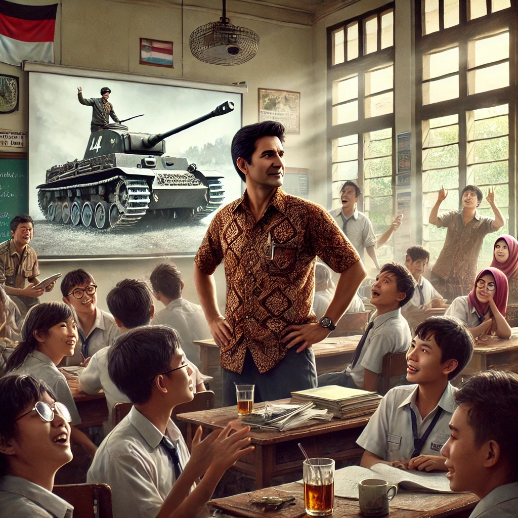 Prediksi Aram benar. Pak Hadi, guru yang tegap dan gagah itu berjalan masuk ke kelas kami sambil menenteng tas laptop di tangan kirinya, dan sebuah tote bag di tangan satunya. Isi tote bag itu agaknya berat sehingga Pak Hadi memerlukan tenaga ekstra untuk mengangkatnya. Beliau meletakkan tas laptopnya di atas meja dan menatap kami semua.