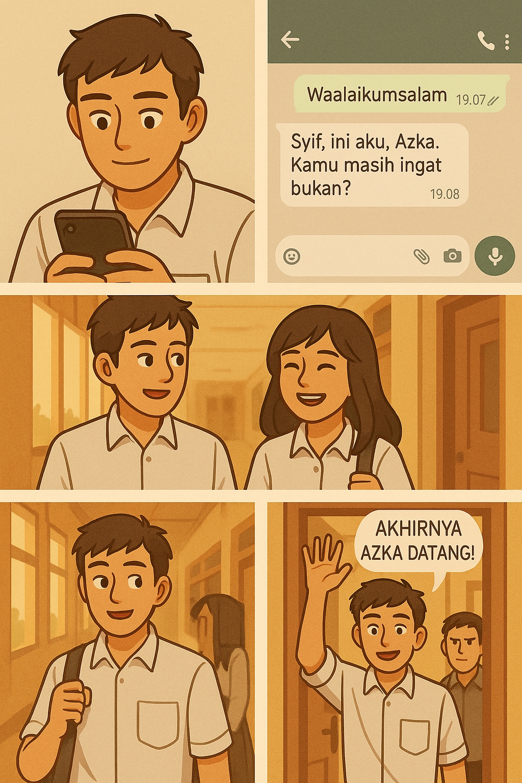 Kurasa paling elok memulai pesan ini dengan salam, “assalamualaikum”. Tercatat, hari Rabu tanggal 16 September, aku memulai men-chat Syifa. Jamnya menunjukkan pukul 18.51. Pesanku itu langsung bercentang dua, abu-abu. Bar status kontak Syifa menunjukkan, terakhir kali dilihat pukul 16.57.