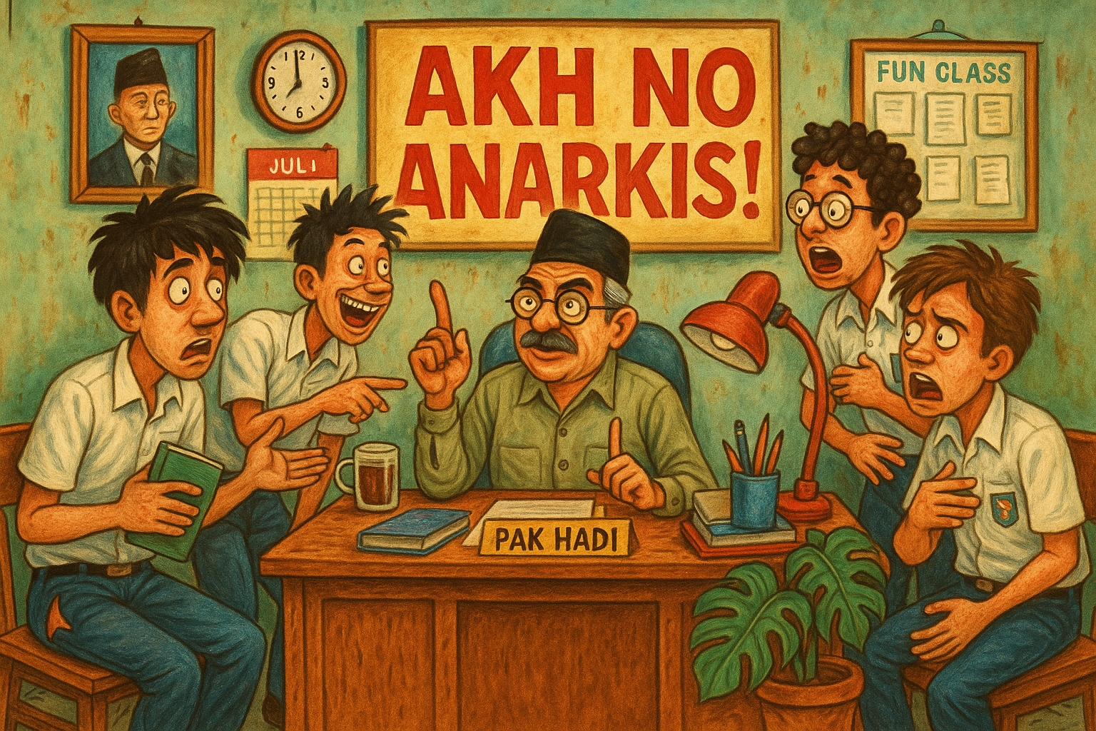 Aram tahu kawan, kami semua juga tahu. Kalau tadi kami sempat kepergok Bu Hartini sedang mengintip, habis sudah. Kami bisa kena skorsing, dan yang lebih parah, keikutsertaan kami dalam Fun Class bisa-bisa dicoret oleh beliau. Jadilah kami lari tunggang langgang kembali ke kantin.