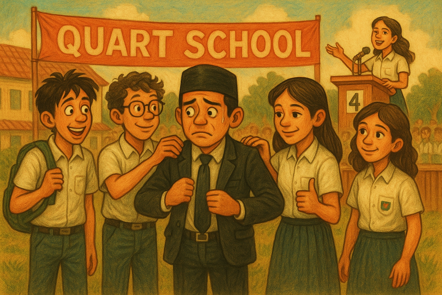 Aku berangkat ke Quart School dengan sangat gugup, dan sampai di depan lokal seperti orang kena malaria. Menggigil bukan main. Gugupku menjalar sampai ke mata kaki. Di tengah-tengah kegugupanku itu, Aram sempat-sempatnya bilang, “kau harus menang Az. Kerahkan semua hasil belajarmu dengan Pak Hadi. Kamu sudah hafal di luar kepala bukan?”