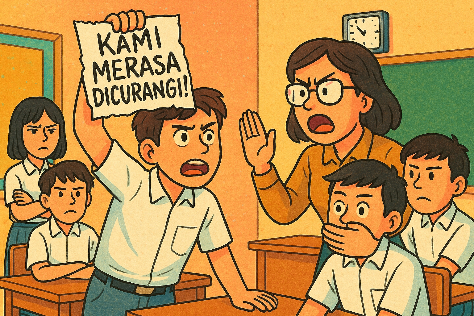 “Apa maksud kamu menulis ini?” Bu Hartini memasang wajah galak.