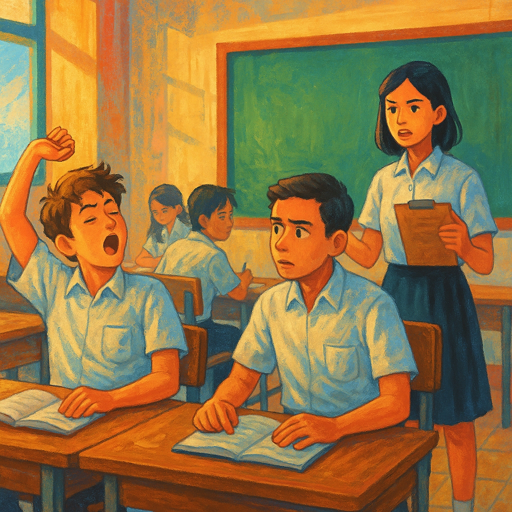 Hari ini jadwal Mid Test tertulis bahasa Inggris. Terlihat semua murid hadir di lokal 4. Artinya semua orang mengikuti sesi Mid Test, tidak ada yang bolos dan kelas ini termasuk kelas yang disukai para murid. Namun tidak dengan Aram. Begitu selesai dia mengerjakan soal itu, dia menggeliat, menguap, lalu berseloroh.