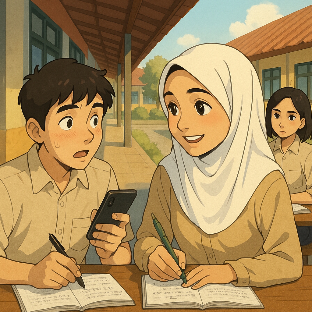 “Alhamdulillah, makasih ya, Az. Oh ya, karena matematika hari ini adalah ujian pertama, maka apa boleh kita belajarnya di kantin sebelum bel masuk kelas, Az?”