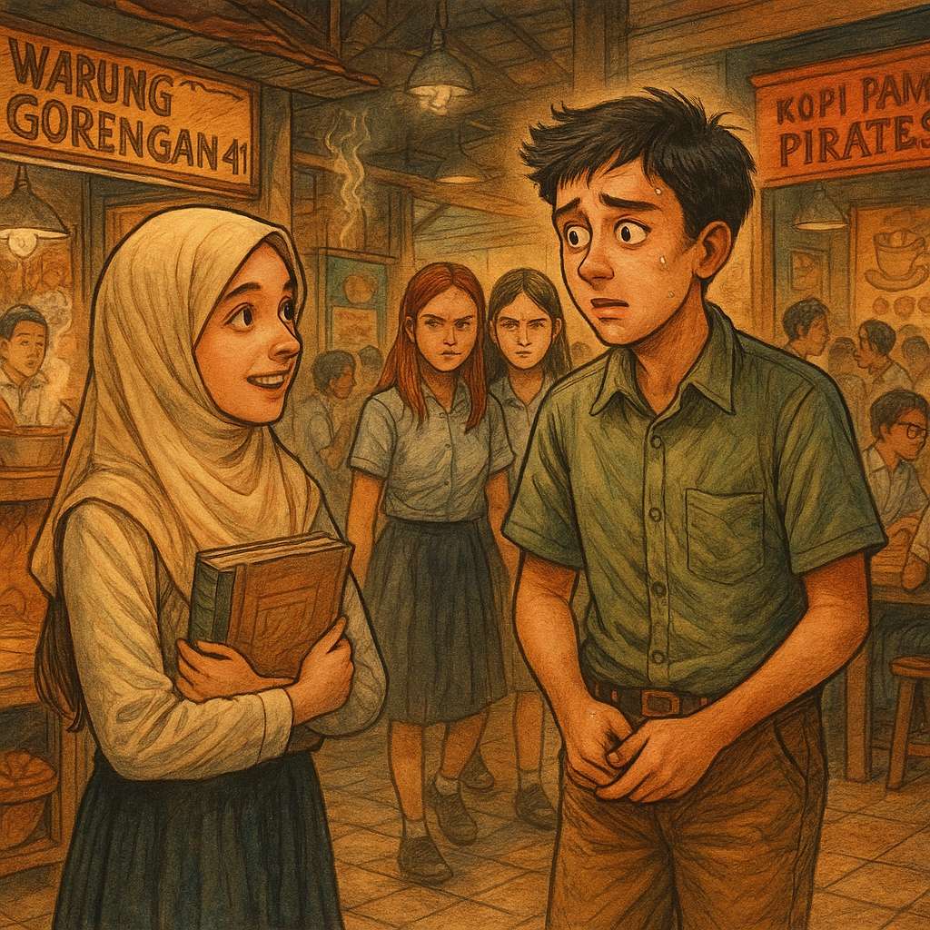 Tak kusangka rupanya Syifa malah pergi ke Kafe Modern. Aku menelan ludah. Seharusnya aku mengantisipasi kemungkinan ini. Kukira tadi Syifa mau pergi ke warung gorengan 41 yang berada di sebelah kafe besar ini. Kini aku terjebak dalam kondisi serba salah.
