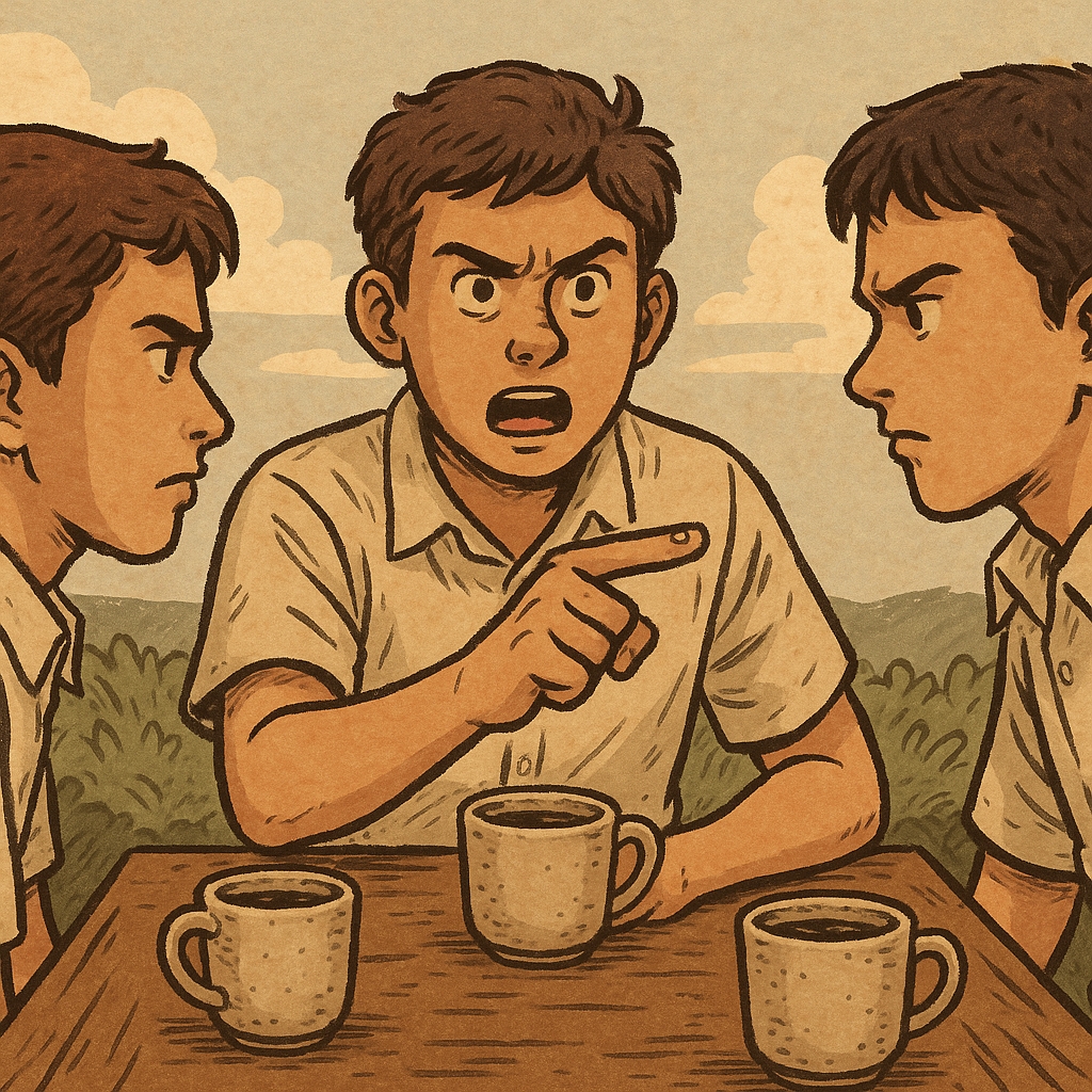 “Ah lemah sekali kau Az, minum kopi kok muntah, aku kemarin minum tiga gelas Bintang Merah, tak muntah tuh, tak mabuk juga.”