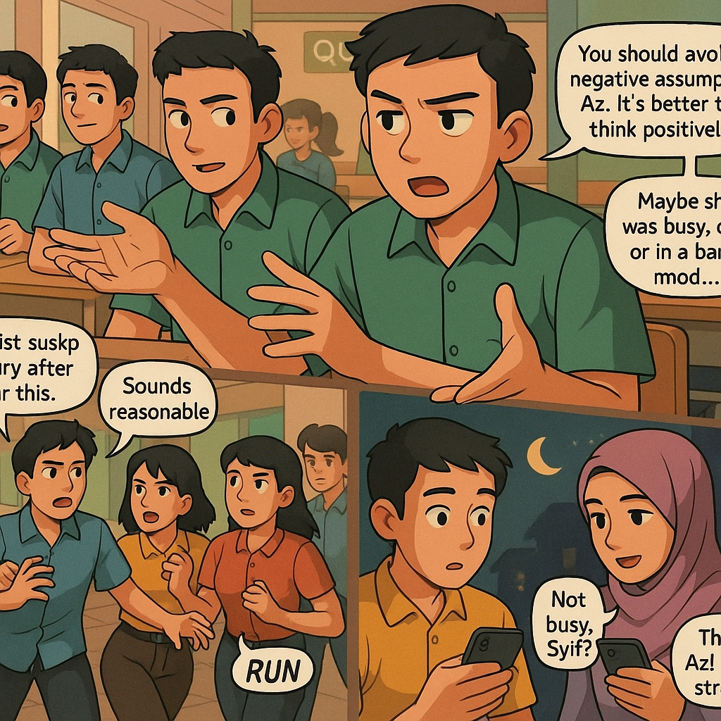 Tuh kan, pecah sudah pertengkaran itu. Okta kelepasan melemparkan plastik es jeruk yang sedang dia pegang. Wahid melihat gelagat itu, tidak mau kena siram, lantas melompat ke kiri. Keputusan brilian yang buruk. Di sebelah kiri kami sekarang adalah got. Sementara aku, yang tidak mau memperpanjang pertikaian, atau malah memperburuknya hingga Syifa terlibat, memutuskan lari kembali ke kelas.