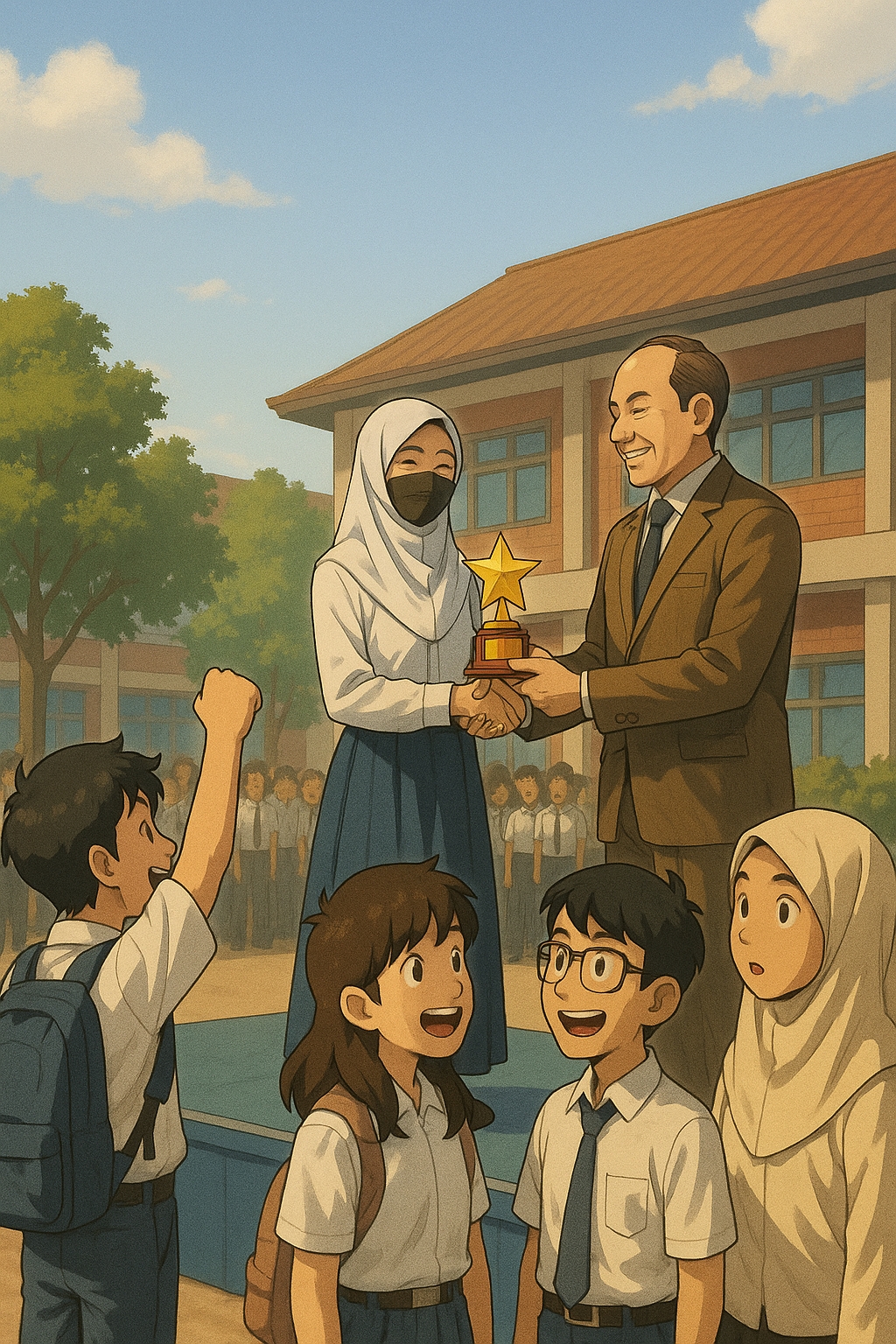 Aku bertemu dengan Mei, Lia, Nasri serta Wahid di lapangan. Di sekeliling kami, murid-murid dari berbagai lokal sibuk berspekulasi, siapa kira-kira bintang pelajar Quart School semester ini? Sementara di atas podium, Pak Kepala Sekolah sedang berdiskusi dengan Bapak Wakasek Kurikulum yang terhormat. Sepertinya mereka mendiskusikan soal piala yang tak kunjung datang.