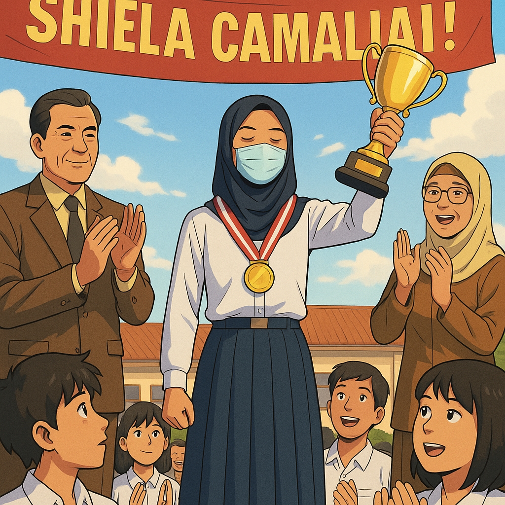 Pak Kepsek menyerahkan medali serta piala kepada gadis bernama Shiela Camalia itu. Saat piala itu dia pegang, semakin riuh sorak-sorai dan tepuk tangan semua orang mengiringinya. Murid laki-laki jauh lebih keras lagi tepuk tangannya. Segera aku menarik kesimpulan bahwa Shiela ini pasti cantik orangnya.