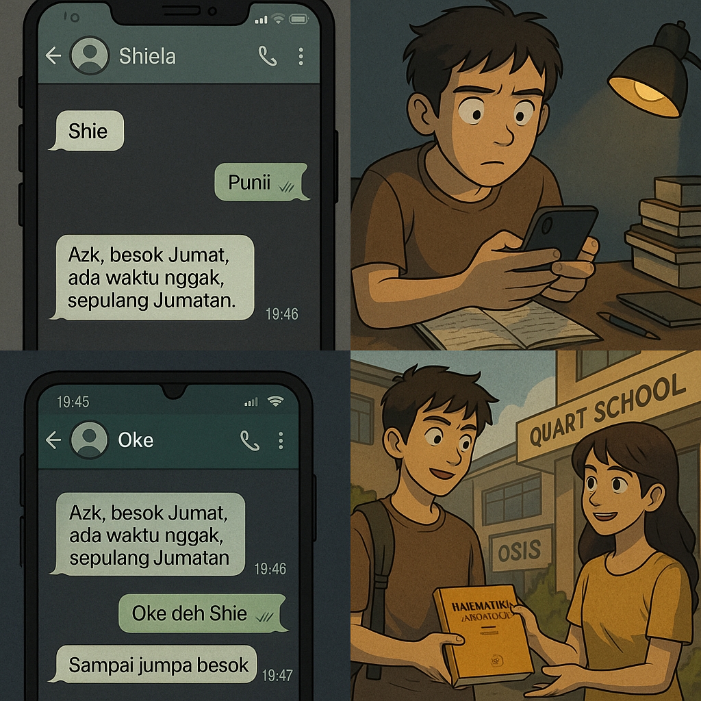 Astaga kawan, engkau boleh merasa heran, hubunganku dengan Shiela Camalia perlahan telah terbangun. Seminggu yang lalu kami baru saja saling kenal, sekarang aku sudah bisa men-chatnya. Padahal katanya, Shiela adalah gadis paling tertutup di Quart School. Kawan boleh heran, karena aku sendiri juga heran.