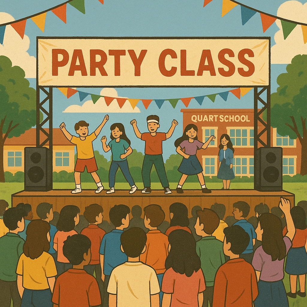 Meriah kawan. Meriah sekali, seperti namanya, Party Class adalah ajang pesta bagi semua murid Quart School. Sebuah panggung besar dibangun di tengah lapangan. Irama musik berdentum keras sudah diputar sejak tadi pagi. Hiasan-hiasan dimana-mana. Para murid yang biasanya memakai baju seragam, sekarang dibolehkan pakai baju yang tidak formal, baju-baju biasa.