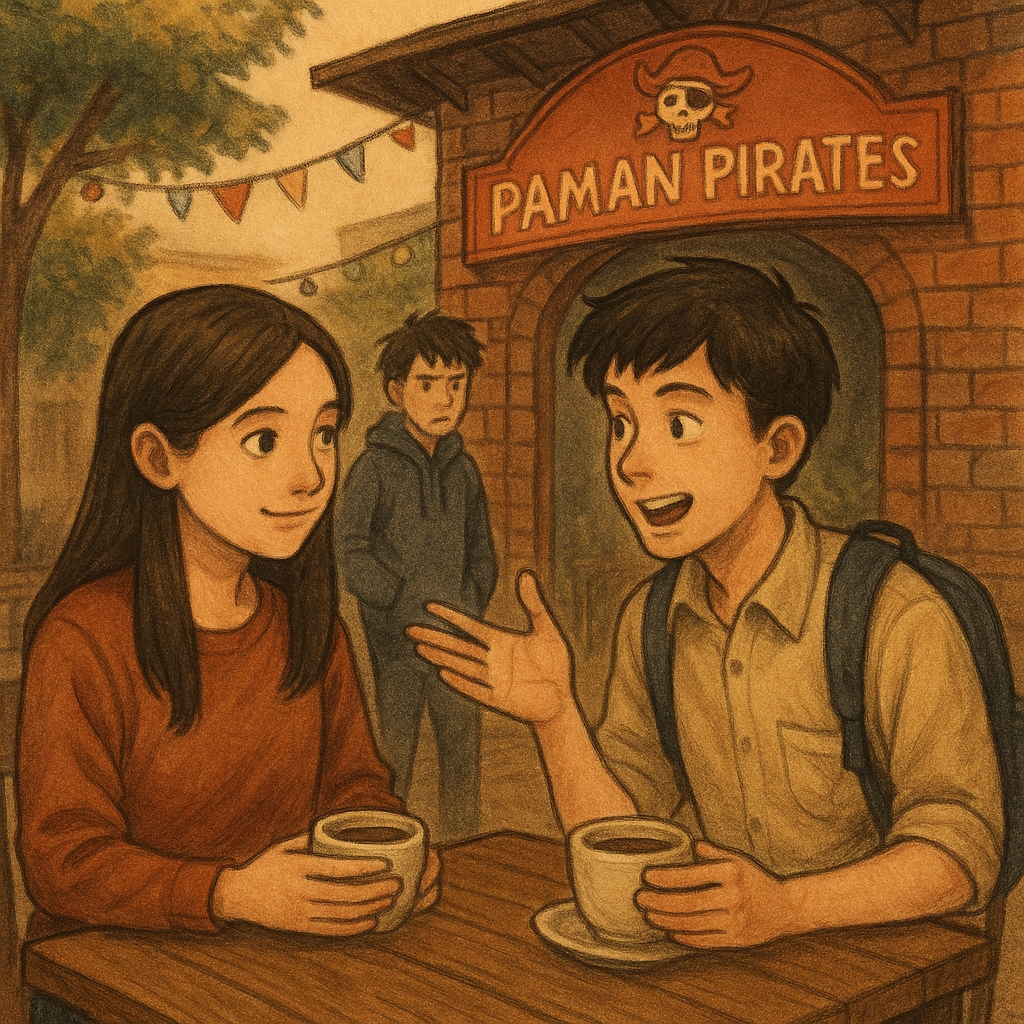 Pulang sekolah hari itu, aku sebenarnya tidak ada niatan hendak ke kantin, bagaimanalah, uangku sudah habis. Namun, saat aku hendak mengambil sepeda motorku di parkiran, aku melihat dia dari kejauhan, sedang duduk santai di Kedai Paman Pirates.