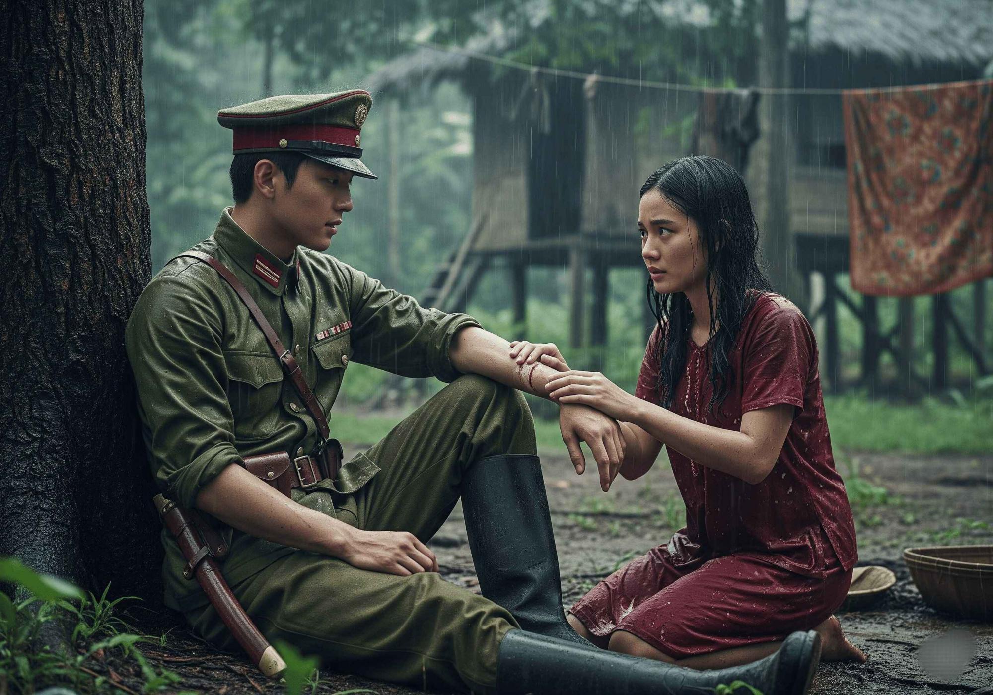Senara terus menyusuri tepian hutan. Langkahnya membawa ke rerumputan tinggi yang mengarah ke jurang kecil. Di sana, di bawah naungan pohon besar, ia melihat sosok bersandar—terluka parah, seragamnya kotor dan basah. Merah-putih dari lambang Matahari Terbit masih tergantung lemas di lengannya.