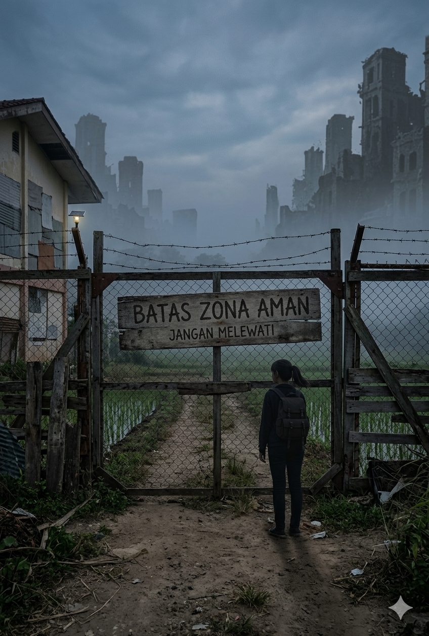 Kabut turun rendah di antara pepohonan. Sawah-sawah kecil mulai ditumbuhi padi muda, seperti tanda bahwa dunia ini pelan-pelan hidup lagi. Dari kejauhan terdengar suara anak-anak tertawa bercampur dengan bunyi peluit pelatih baris. Naya berjalan di jalan tanah, memegang buku catatan lusuhnya, dan langkahnya berhenti di pagar kayu tinggi dengan tulisan “BATAS ZONA AMAN”.