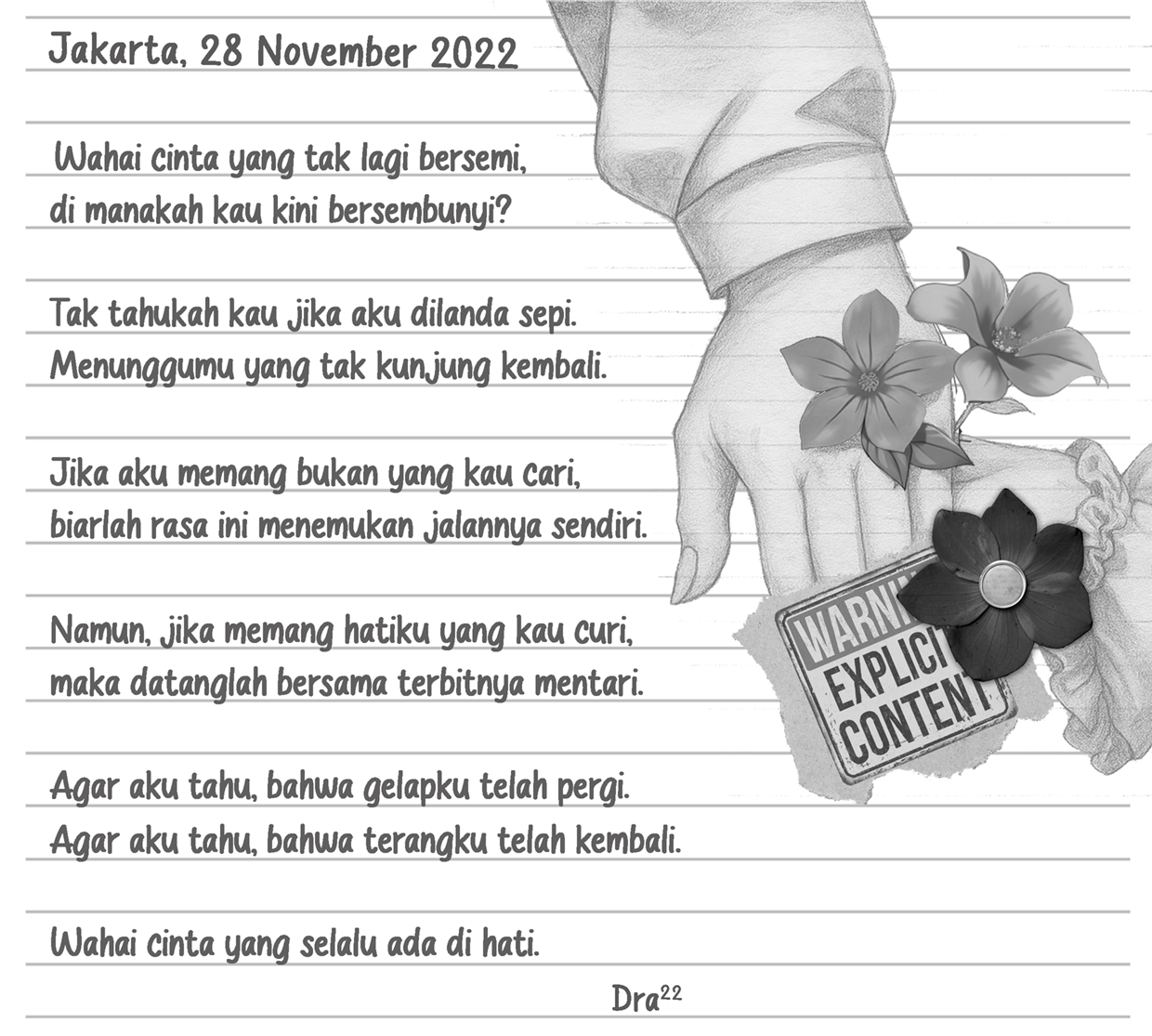 “Ya, mungkin sekarang lo bisa ngomong begini, Dra. Tapi, kalo suatu saat nanti lo bener-bener suka sama dia, masa lo nggak mau ngelanggar prinsip lo, dan mengabaikannya begitu saja kawan?” ucapnya, dengan kedua tangannya yang terbuka lebar. Sementara gue membeku, membayangkan seseorang yang masih gue tunggu.