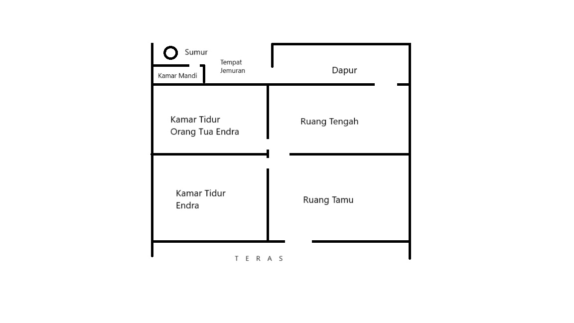 Anjani tidak bisa terus-menerus memikirkan soal tidak jelas seperti ini. Ia menyalakan laptopnya lagi. Ia membuka aplikasi untuk membuat denah sederhana. Rumah di kebun belakang jauh lebih sederhana daripada rumah keluarga Mbah Lurah yang di depan. Ia mulai dengan membuat segi empat lantas membaginya menjadi empat bagian dengan ukuran berbeda. Lalu, ia menambahkan teras di bagian depan, sedangkan dapur, kamar mandi, dan sumur di bagian belakang. Ia memberi keterangan pada tiap kamar sesuai penggunaan awal. Ia memandangi denah yang baru saja ia buat. Ia tertegun ketika memperhatikan posisi bagian dalam rumah itu. Sekilas, tidak ada yang aneh. Ia hanya penasaran dengan dua kamar tidur yang posisinya bersebelahan, depan dan belakang. Ia belum pernah masuk meski pintunya tidak dikunci.