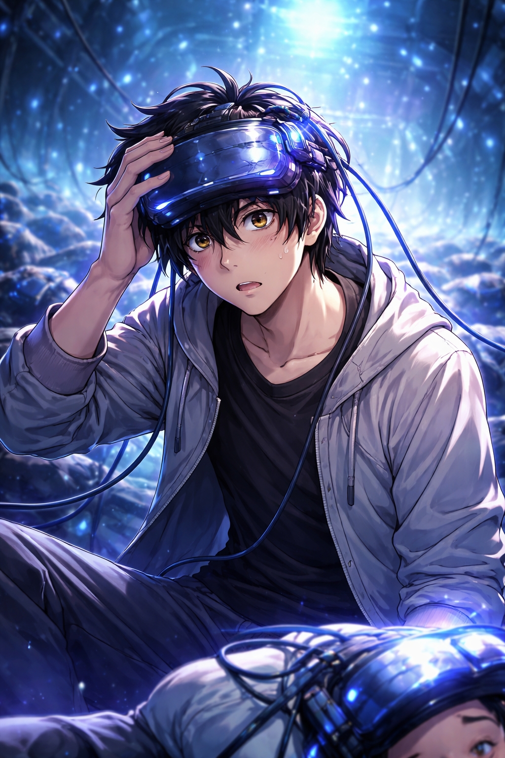 Dan di kepala mereka terpasang perangkat yang sama. Helm game VR. Cahaya tipis mengalir dari setiap perangkat itu.