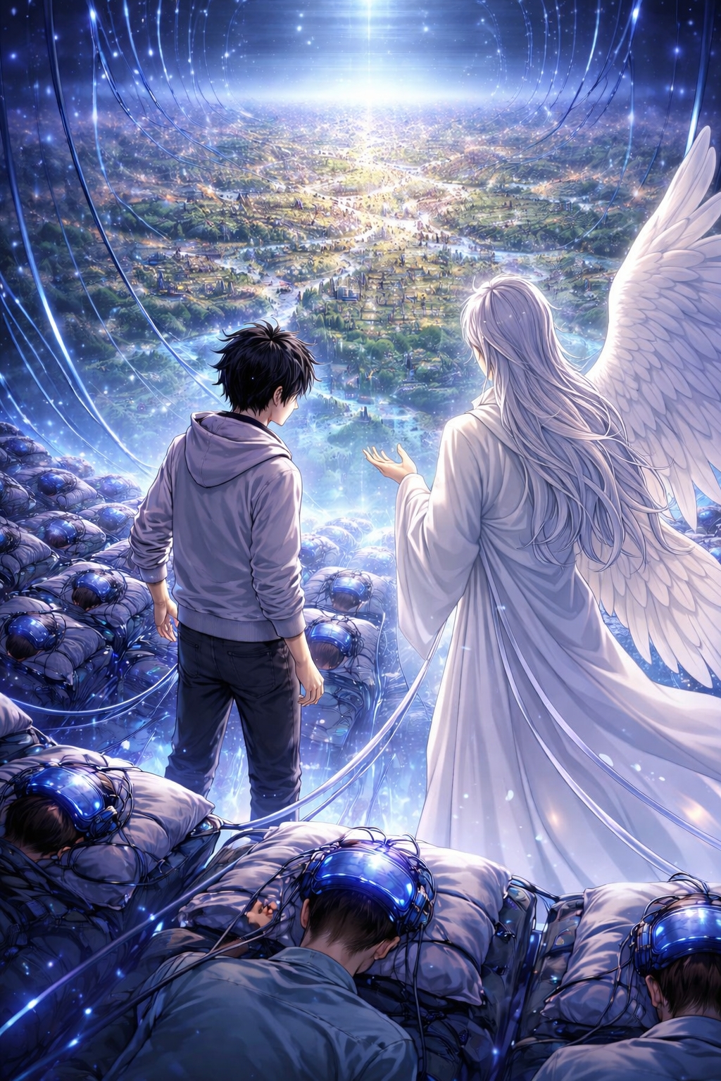 Tali-tali hologram menjulur dari setiap tubuh yang tertidur di atas, menghubungkan mereka ke sosok-sosok kecil di dunia bawah.