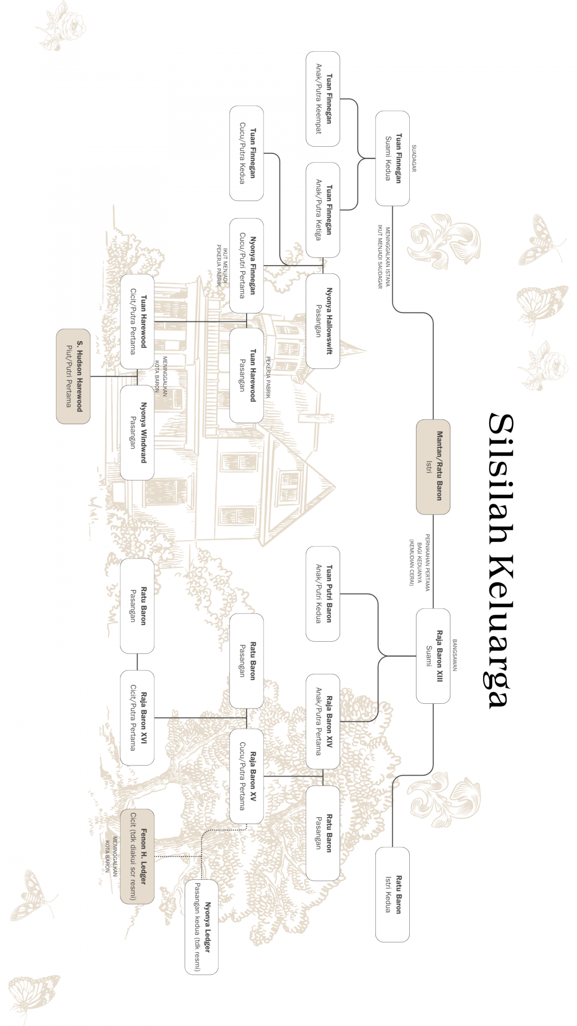 Poin yang bisa dibahas adalah istri kedua Raja Baron XV secara tidak resmi, yaitu Nyonya Ledger. Pernikahan mereka tidak pernah digelar. Putra yang lahir dari hubungan mereka adalah Fenon Hugh Ledger. Dia tidak diakui secara resmi sebagai pangeran. Bahkan tidak bisa mendapatkan nama keluarga bangsawan Baron sehingga menggunakan nama keluarga ibunya, yaitu Ledger. Fenon dengan dirinya yang tak dianggap di istana, memutuskan untuk meninggalkan Istana Baron sekaligus Kota Baron di usia dua puluh lima tahun.