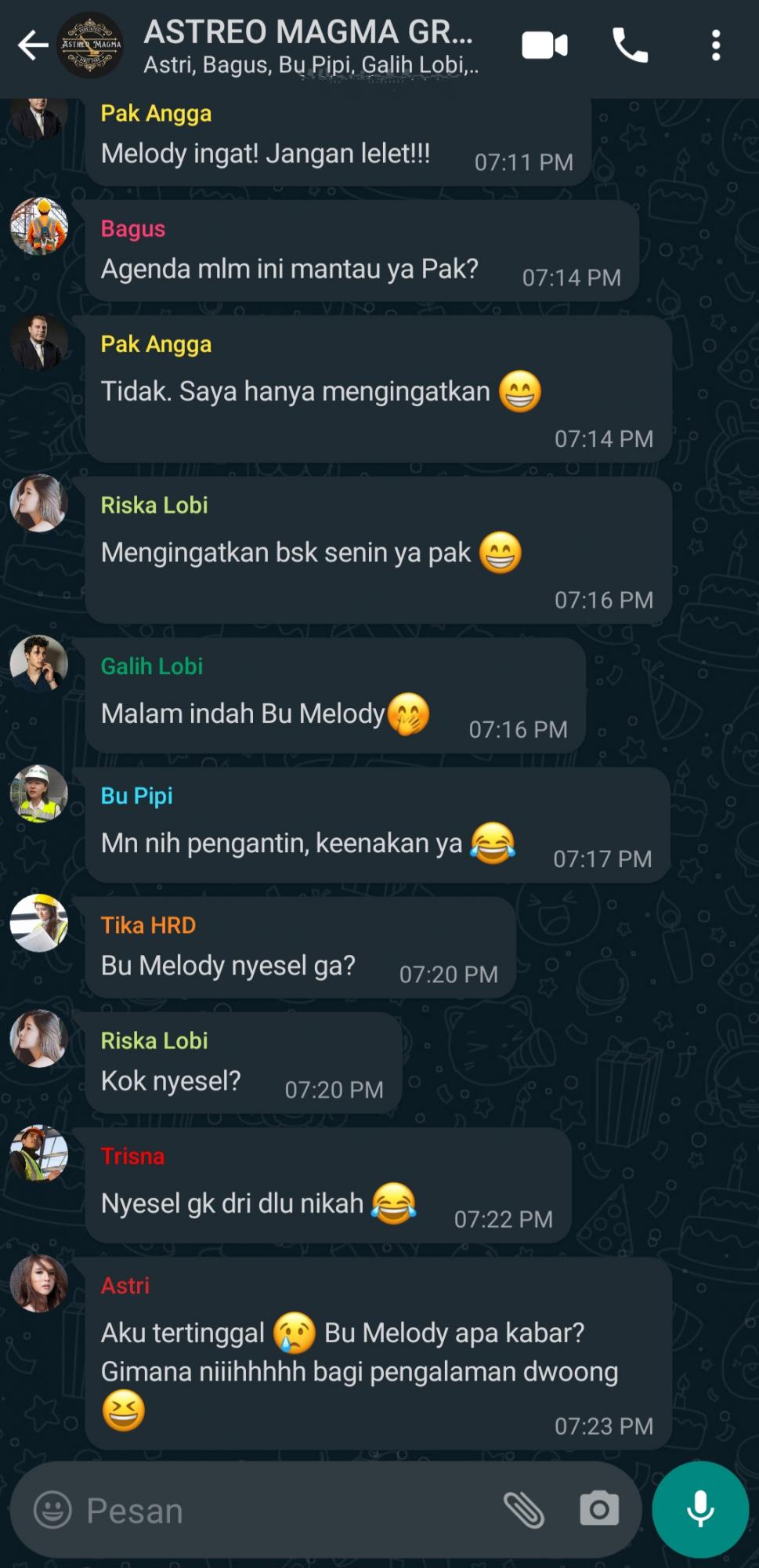 Benar saja dugaan Melody, untung saja semalam dia tidak membuka ponsel karena di grup Astreo Magma gempar menggoda Melody soal pengalaman malam pertamanya dengan Nada. Jelas membuat Melody geli membacanya.