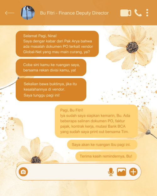 "Sekarang saya mau mendengarkan langsung dari kamu, Nina. Jelaskan dari awal mengapa ini bisa adanya kejanggalan dari vendor dan murni bukan salah input dari kamu? Bersama dengan data yang kamu dan tim Finance temukan."
