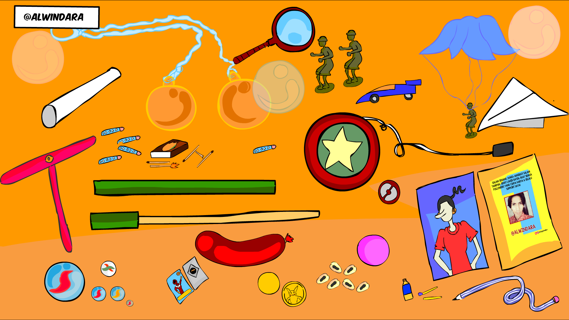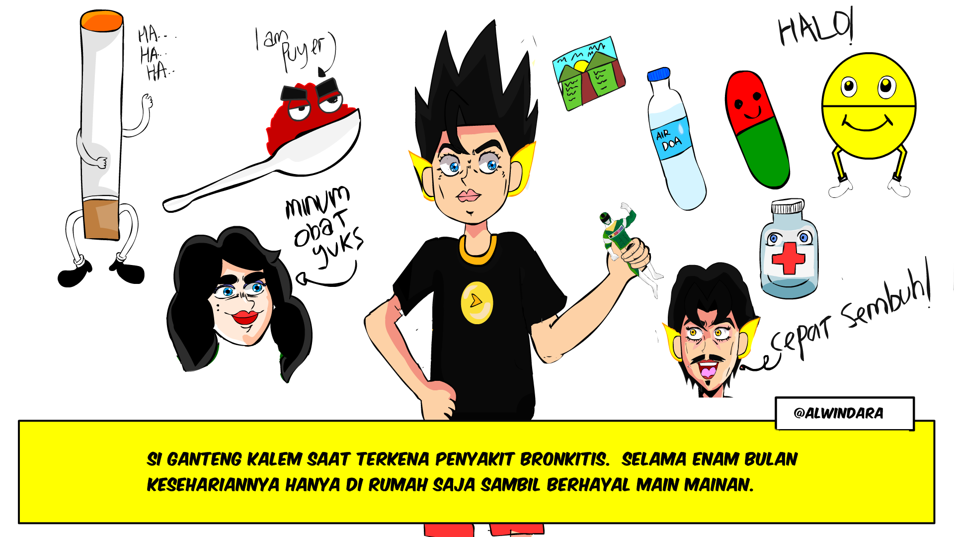 Ohok! Dahakku begitu dahsyat, terus batuk berulang-ulang, berisik seperti burung pelatuk yang sedang mematuk. Napasku tersengal, jalanku terseok-seok, dadaku terasa pedih seperti ditonjok berulang kali dari dalam. Ternyata, aku malah mengidap bronchitis akibat menjadi perokok pasif. Di awal tahun 2000-an, selain musim penculikan, penyakit kurang duit dan masalah paru-paru memang menjadi salah satu momok. Aku bukan satu-satunya. Teman sekelasku, Saiful Anwar dan sepupuku, Rian, juga sempat terserang penyakit menyebalkan ini. Ganas, tak peduli kamu aki-aki, artis bahenol, dan bocah ingus sekalipun, selama bergaul dekat perokok pasti bisa tertular. Gara-gara menjadi perokok pasif, setiap sebulan sekali aku harus check up ke dokter dan meminum puyer yang sepahit tahi kuda. Selama enam bulan penuh, obat harus diminum setiap hari, tak boleh terlewat. Jika terlewat sehari saja, perawatan dimulai dari nol. Untungnya, usaha Keluarga Pandawa cukup maju, uang bukanlah masalah jika dibanding kesehatanku. Karena merasa bersalah, setiap sebulan sekali, Bapak Uu mengantarku check up ke dokter anak di kota Tasikmalaya. Setiap pergi ke kota, Bapak selalu menemaniku berburu mainan baru. Mainan-mainan bisu yang kubeli jadi pasukan penghibur kesepian. Ada untungnya juga, aku jadi sering liburan, dan bertemu sepupu-sepupuku di Jalan Jiwa Besar.