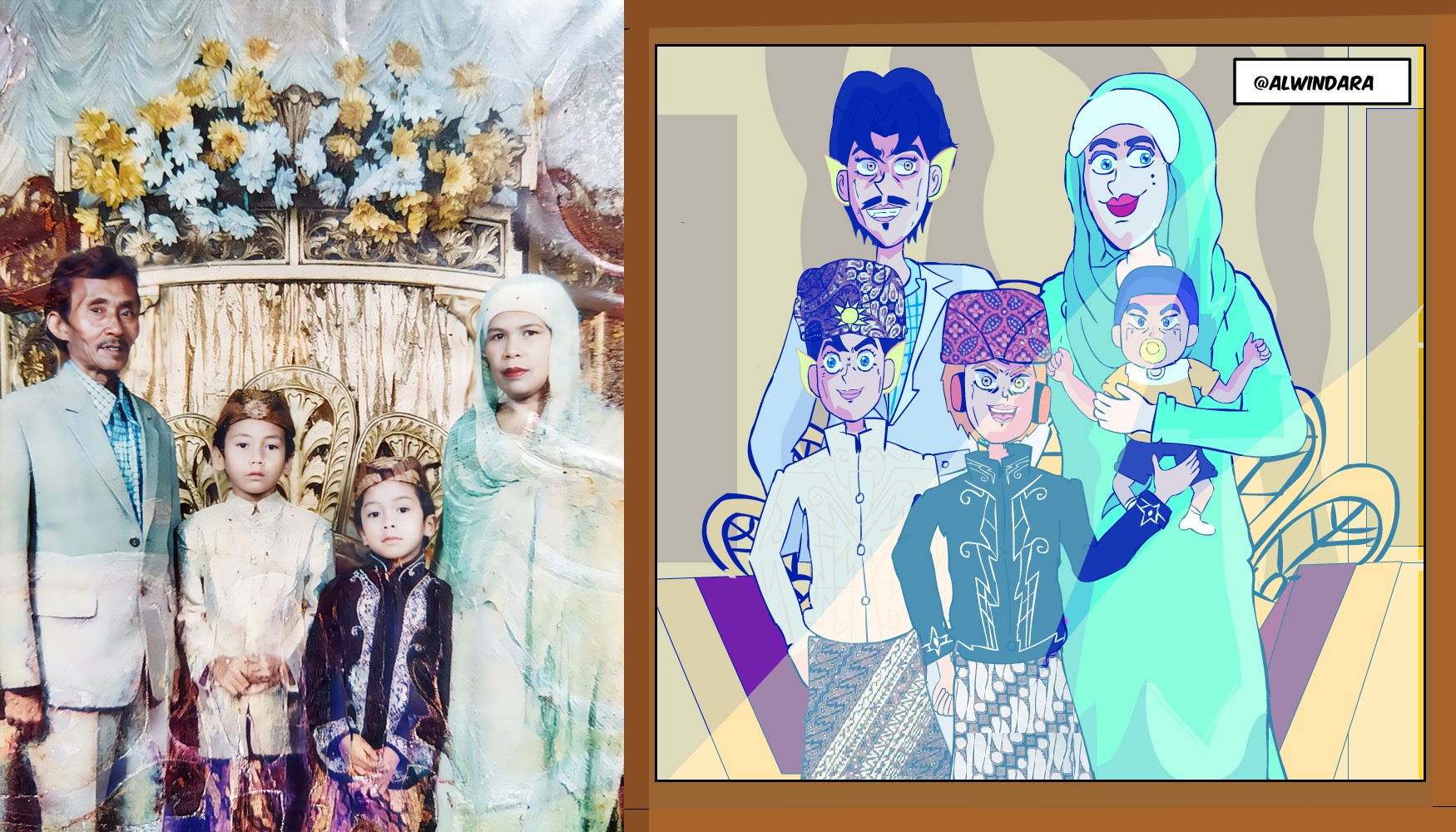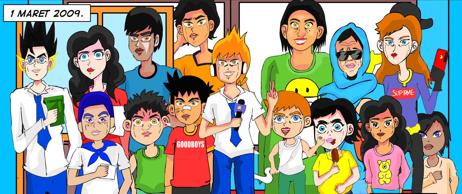 Ilustrasi: (depan: Alwinn, Diman, Akmal, Hilal, Dafa, Ulan, Yanti. Belakang: Neng Dina, Hendrik, A Iwan, Mah Bibi, Emak, Dini, dan April.)