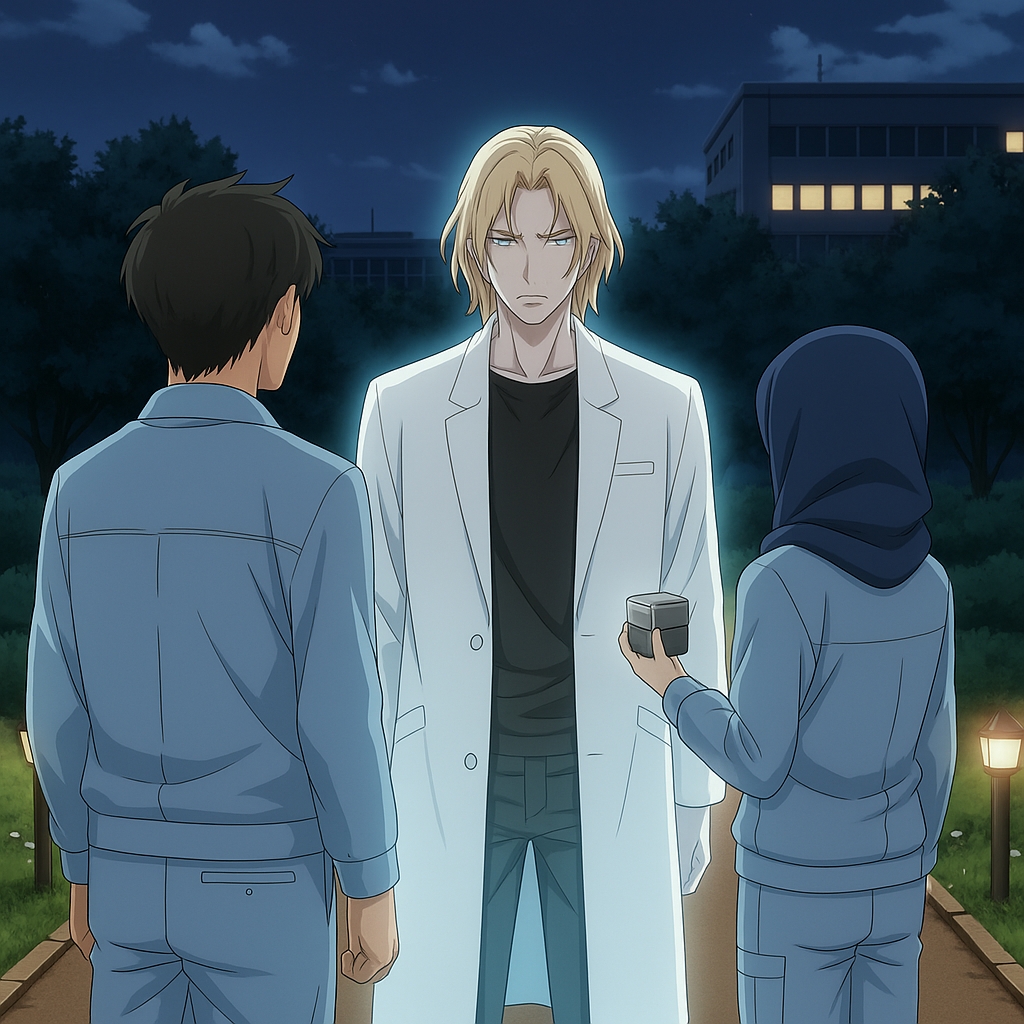 Hah? Apa? Daritadi dia ngomong apaan sih? Ekspresi wajahku pasti kelihatan seperti orang bingung. Aku menoleh ke arah Takahashi san. Mungkin saja beliau mengerti apa yang setan itu bicarakan. Tapi, sepertinya Takahashi san juga tidak mengerti, karena beliau hanya menggelengkan kepala. Pria bule itu menghela nafas. Sepertinya dia sadar kalau aku dan Takahashi san tidak mengerti apa yang diucapkannya. Ia mengeluarkan sebuah permen dari saku jas lab nya, lalu memakannya.