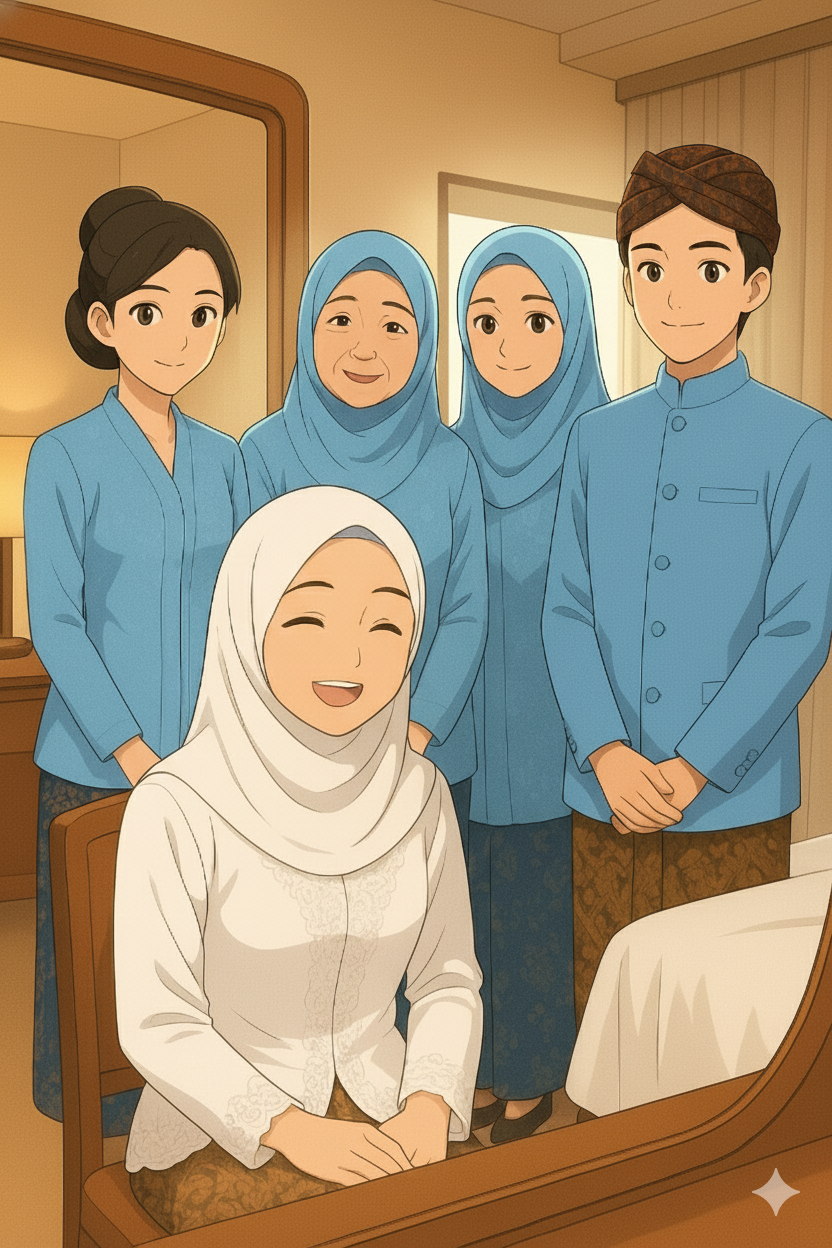 "Mba, kamu cantik banget ternyata kalo make-up begini!" Mia adikku yang nomor dua, tumben sekali memujiku. Karena biasanya, adikku yang menyebalkan ini suka mengejekku dekil karena saking bedanya warna kulit kami. Aku menoleh ke arah Mia. Aku melihat ia memakai kebaya biru muda yang cantik seperti Mama dan Karin adikku. Satrio yang akan menjadi wali nikahku pun memakai setelan biru muda dengan kain batik ala Jawa sebagai ornamen setelannya.